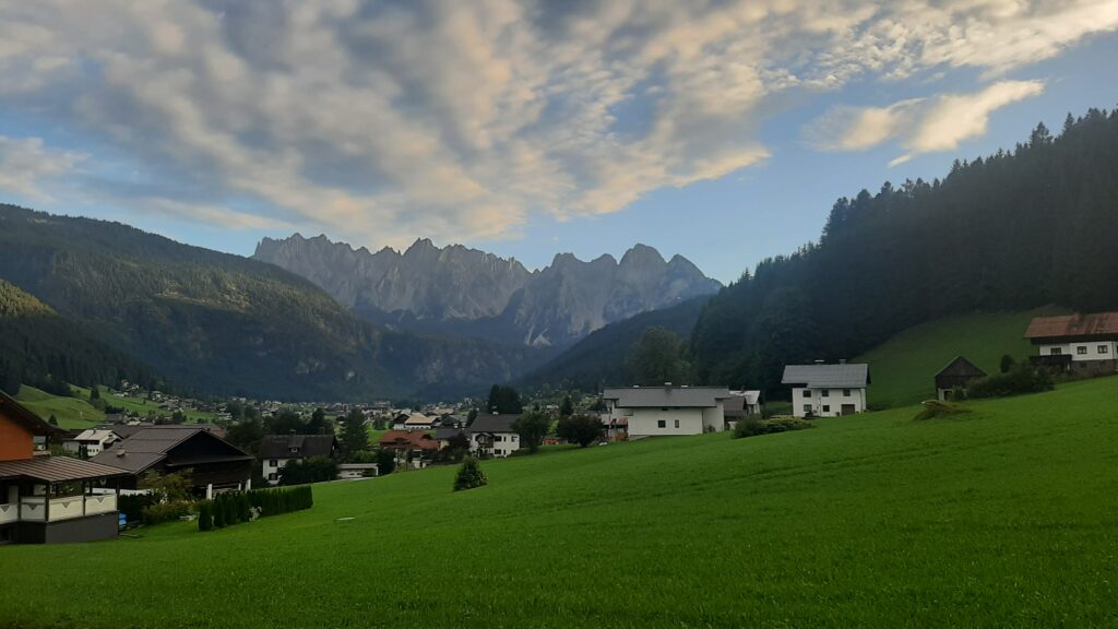 In Gosau suchte ich mir den nächstbesten Wirten und genoß mein Abendessen. Danach ging ich durch den Ort und sprach den ersten Menschen an, den ich sah, mit der Bitte im Vorgarten mein Zelt aufbauen zu dürfen. Ein älterer Herr, der zunächst mein Anliegen nicht so recht verstand, willigte dann ein und so baute ich mein Zelt im Vorgarten auf. Es stellte sich heraus dass der nette Herr schon ziemlich dement war. Er konnte zwar nicht verstehen warum man sich so eine Wanderung antut, war aber sehr gastfreundlich und hat mir dann auch noch abends ein Bier angeboten 😉
