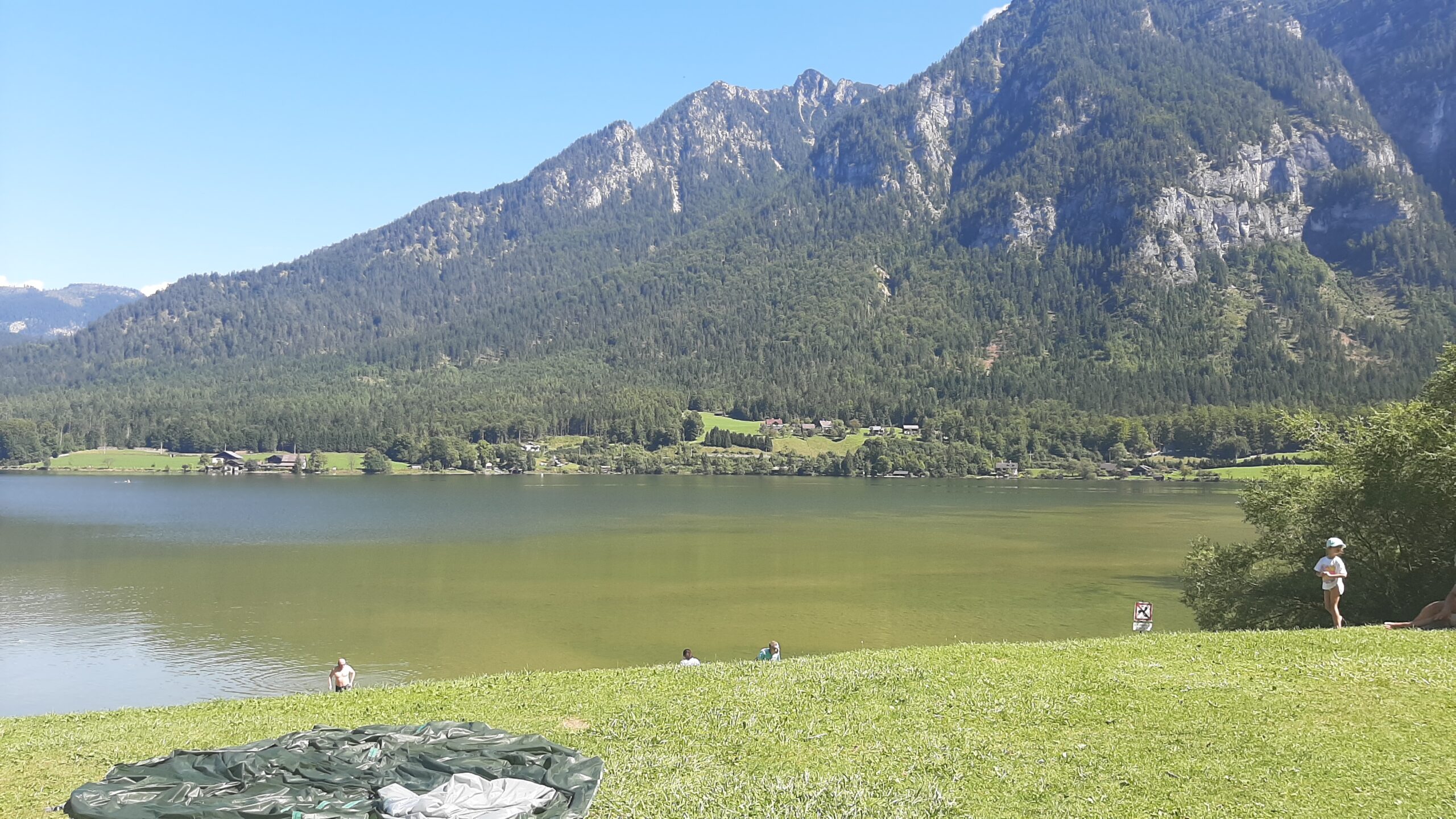 Am frühen Nachmittag kam ich nach einem 2-3 stündigen Straßenhatscher schließlich auf einem Parkplatz beim Hallstättersee an, der eine wunderschöne Wiese ein Beisl und Seezugang hatte…..