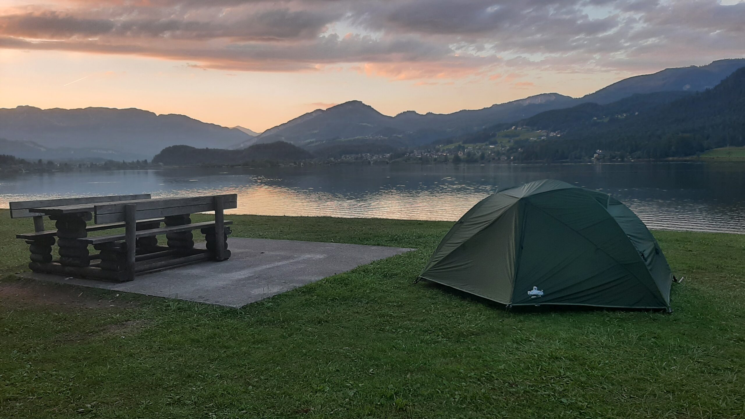 Schnell baute ich mein Zelt auf und genoss noch die Abendsonne bei köstlichem Essen und leckeren Bieren.