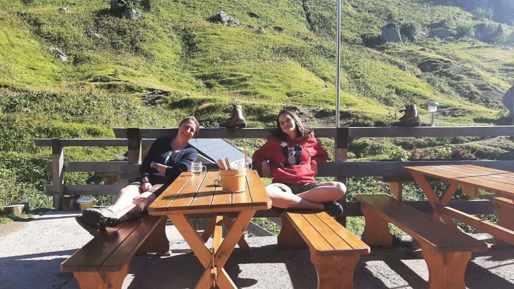 Als Nachmittagssnack bekam ich das allerbeste Speckbrot ever….(leider habe ich davon kein Foto gemacht). Danach chillte ich mit dem jungen Hüttenteam weiter auf der Sonnenterrasse, bis die nächsten Gäste eintröpfelten, die alle über nacht bleiben würden.
