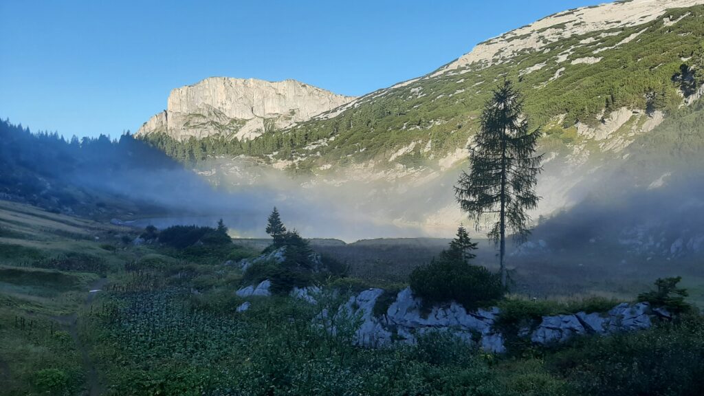 Während ich mit Daunenjacke den Nebel begutachtete, stapfte SEPP (der nette Abteurer vom Vorabend) in Unterhose vorbei Richtung See um ein wenig baden zu gehen….Es hatte ja immerhin 2 Grad oder so…. 🙂