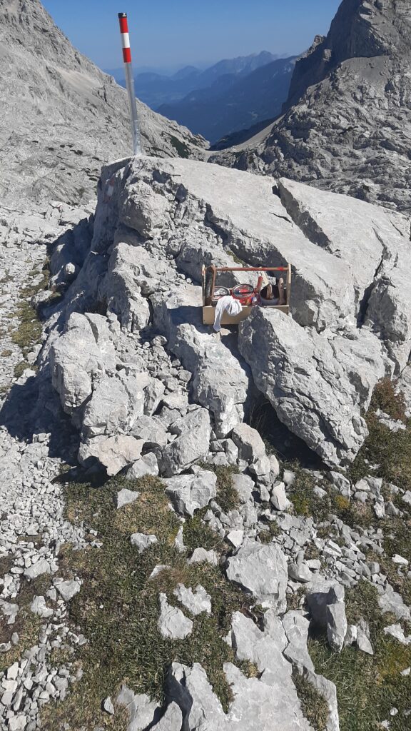 Nachdem ich schon vor einigen Jahren mit Daria und Hummel die Tour (in die andere Richtung) gegangen war, wusste ich dass mitten im Toten Gebirge noch eine Kunstinstallation auf mich warten würde….und endlich sah ich sie wieder 🙂 (ohne Zoom wird man die 4 Betten wohl nicht sehen 🙂