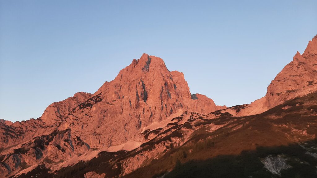 Schließlich kam ich am späten Nachmittag am Prielschutzhaus an, organisierte mir einen Lagerplatz und genoss noch das herrliche Farbspiel…
