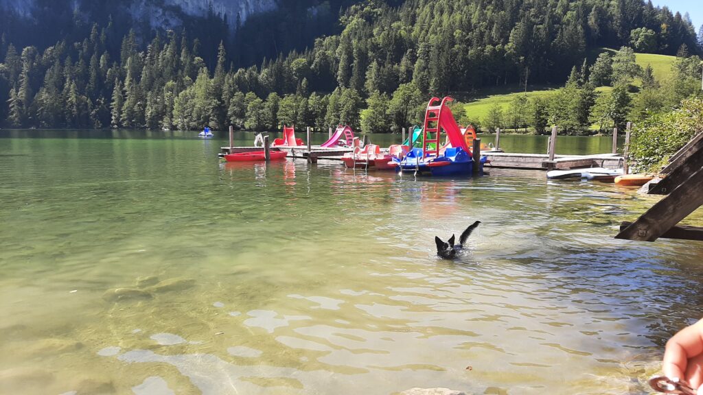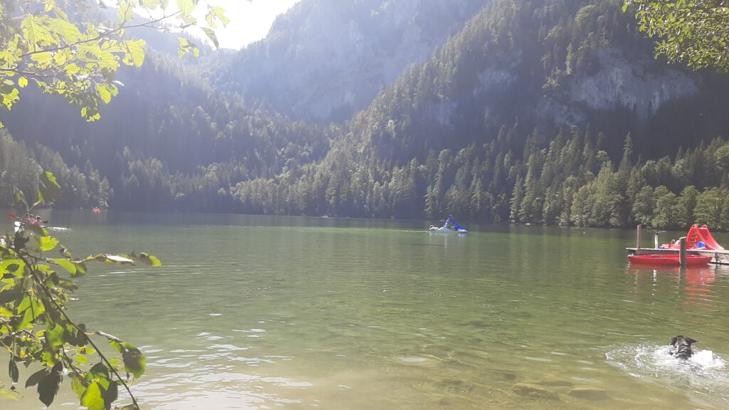 Direkt am Gleinkersee war der Campingplatz (für den ich mich am Vortag „leider“ nicht entschieden hatte) direkt am See inmitten eines herrlichen Bergpanoramas. Daneben war der Gasthof Seebauer, wo wir ein leckeres Mittagessen bekamen. Danach gings nocht ab zum See, wo auch Pria (unser Hund) ihren Spaß im Wasser hatte.